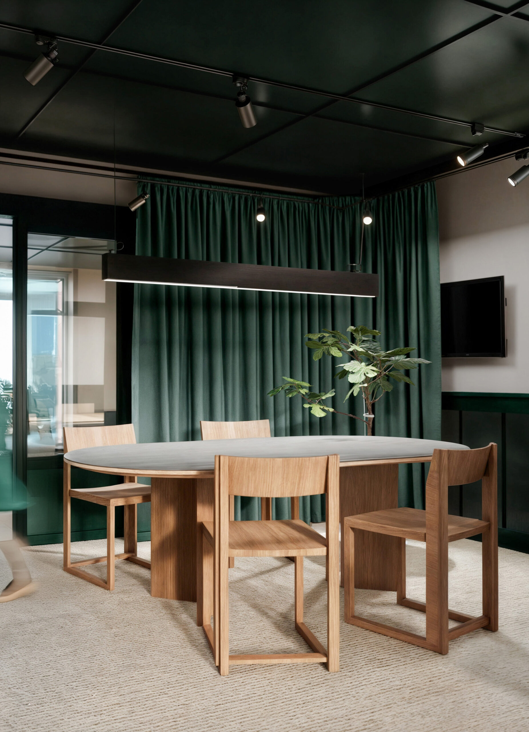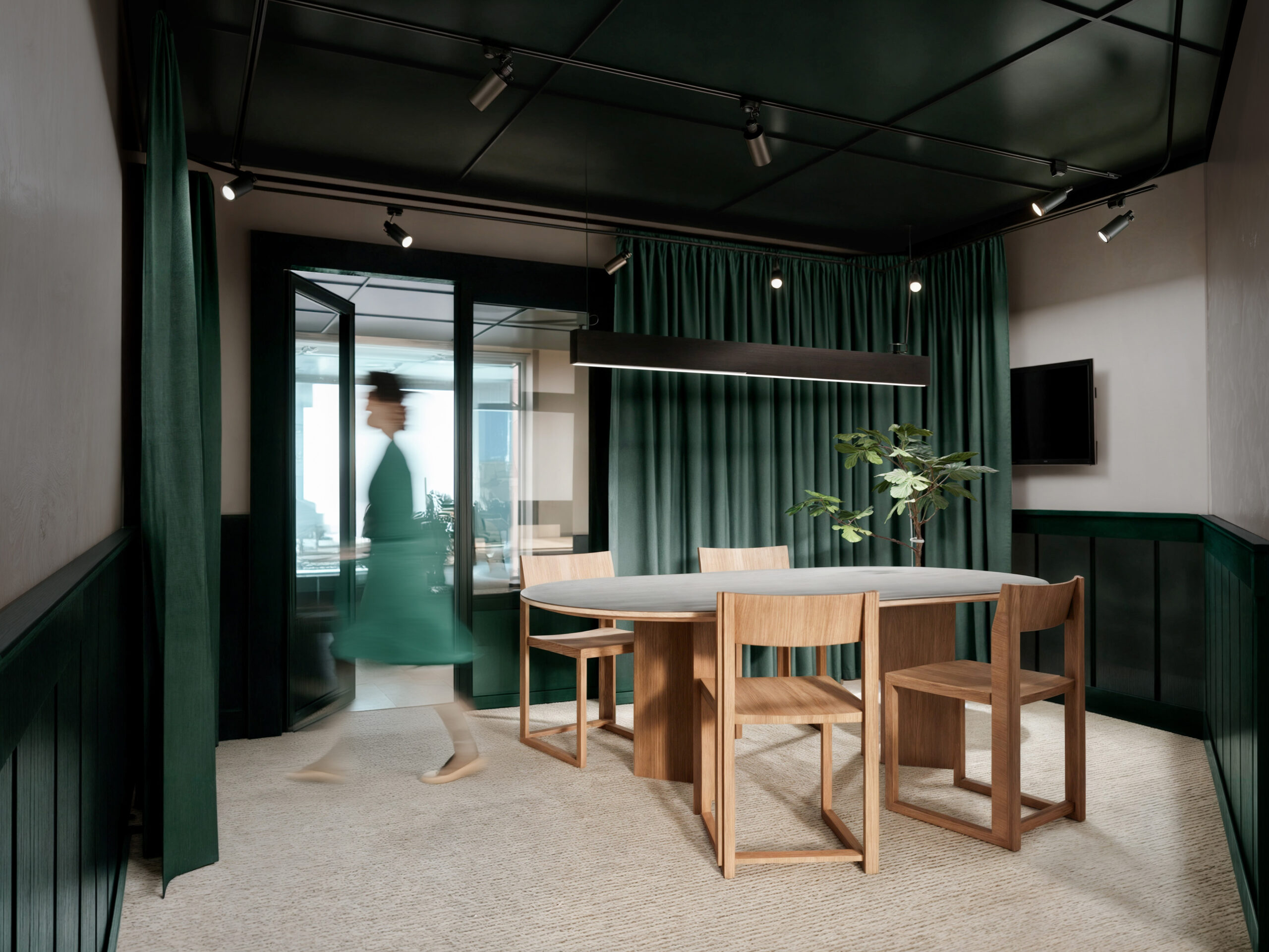 Farvepaletten er baseret på en dyb grøn tone, der harmonerer med detaljer i rød kontrast og det lyse, luftige udtryk, som forbindes med Skagen. Vi skabte en række forskellige zoner i indretningen ved hjælp af tekstiler og gardiner i varierende farver og strukturer, der fungerer som overgange mellem private og semioffentlige områder. Disse materialer bidrager både til akustikken og skaber en hjemlig atmosfære.